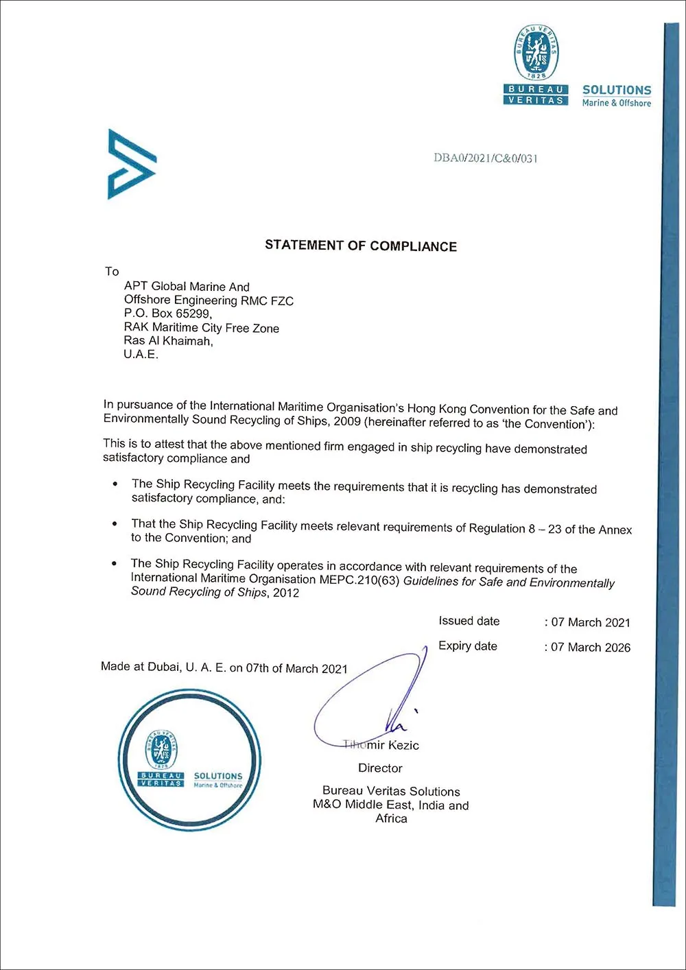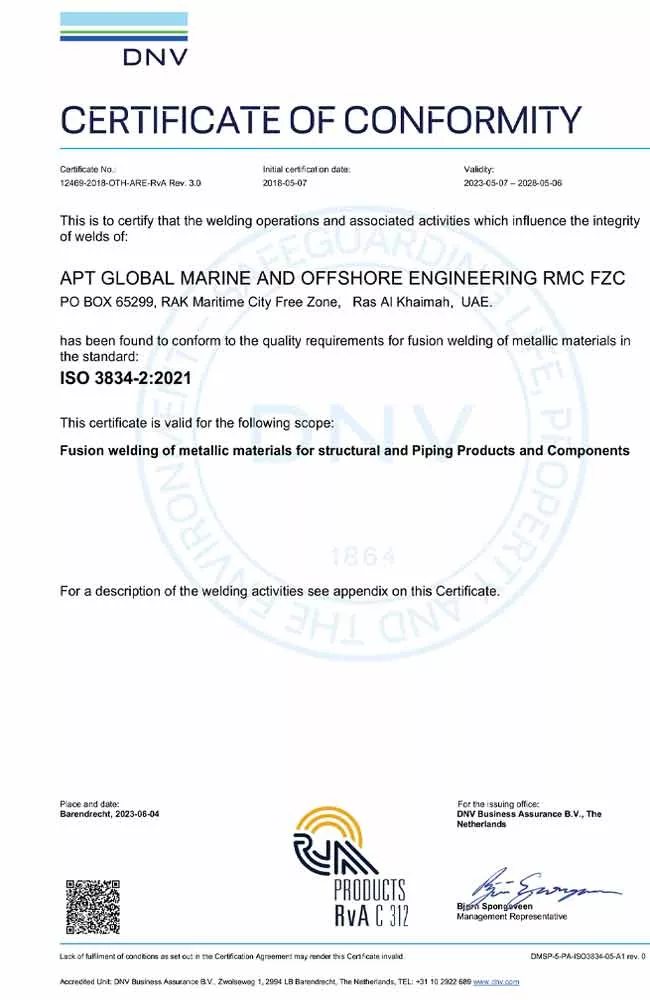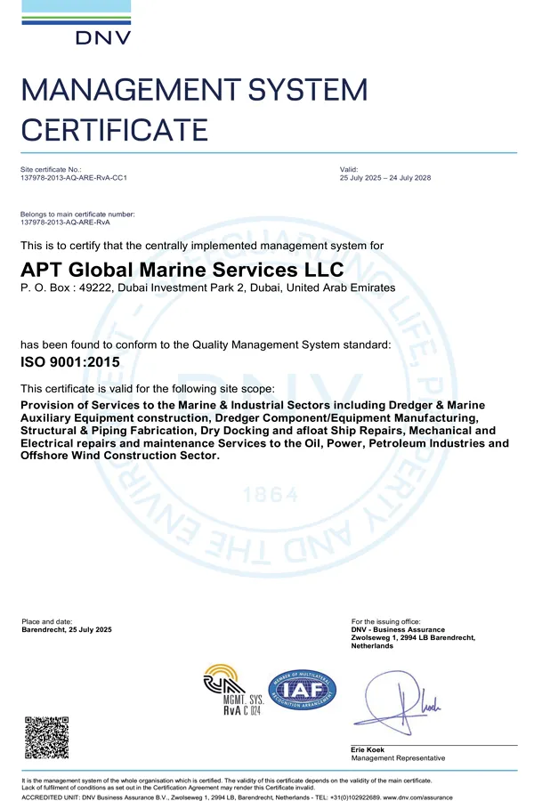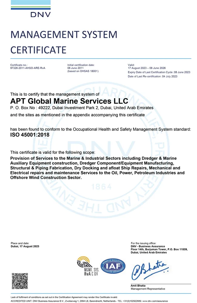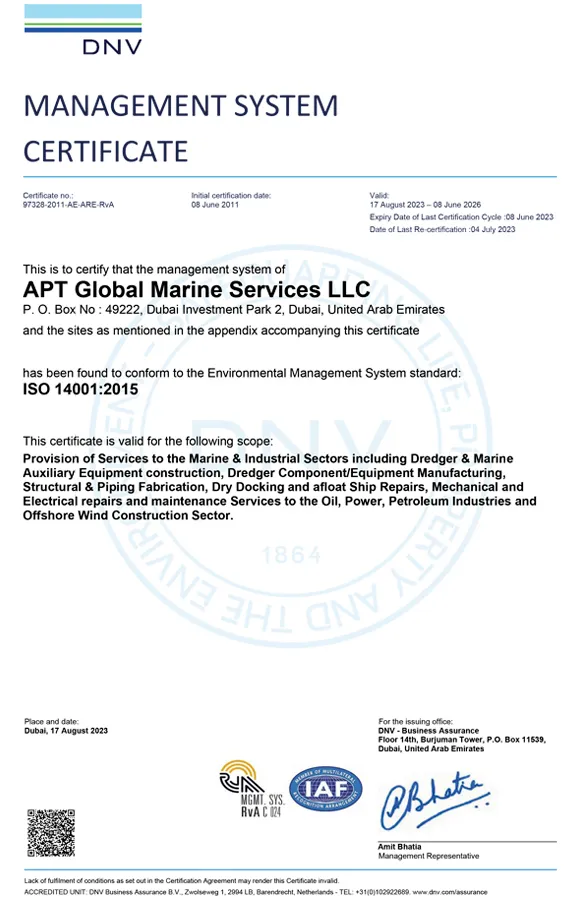 operations in Dubai, Qatar, and India have been certified with ISO 9001:2015, ISO 14001:2015, and ISO 45001:2018.