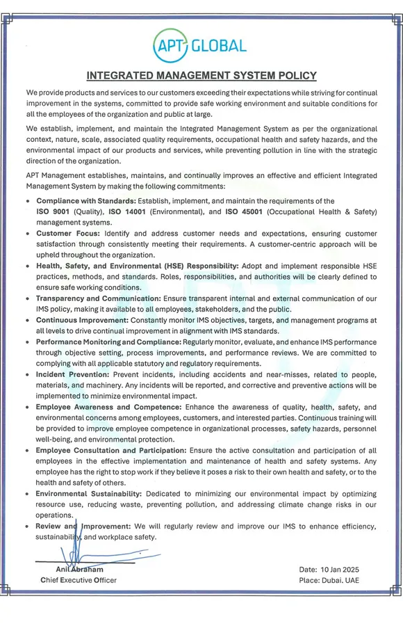 Our commitment to Quality, Health, Safety, and Environment is built on robust policies, international standards, and a culture of continuous improvement. Through a systematic approach to meet client needs, strict process control, and proactive risk management, APT Global ensures consistent performance and customer satisfaction across all projects.